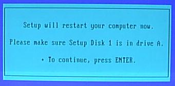 You are now prompted that the system will restart, hit enter to continue and keep Disk 1 in the drive.