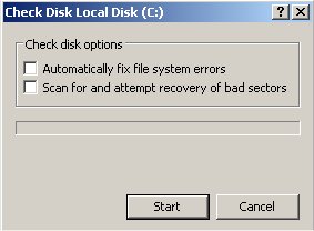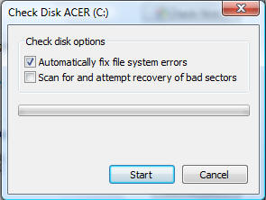 The chkdsk (scandisk) screen will now appear, select all the boxes and click on “Start”. Scandisk will begin. You may also be prompted to restart your computer to run scan. Do this to continue.