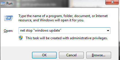 Windows 8, 7 & Vista: Click start/all programs accessories then run and type: net stop "windows update"