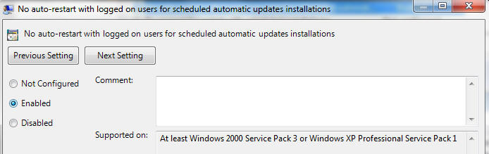 Permanent fix Now navigate to Local Computer Policy/Computer Configuration/Administrative Templates/Windows Components and then Windows Update. Double click No auto-restart for scheduled Automatic Updates installation then choose Enabled and click OK. Windows 2000 SP3+ and Windows XP SP1+: Click start then run and type: GPEDIT.MSCWindows 7 and Vista: Click start/all programs accessories then run and type: GPEDIT.MSC Now navigate to Local Computer Policy/Computer Configuration/Administrative Templates/Windows Components and then Windows Update. Double click No auto-restart for scheduled Automatic Updates installation then choose Enabled and click OK.