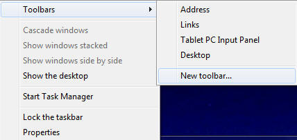 To add a folder to your taskbar simply right click on it, select "Toolbar" and then "New toolbar" and select the folder you wish to shortcut too. Once picked click "Select folder" to complete | ||