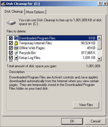 Click Start, All Programs, Accessories, System Tools, and then Disk Cleanup (If more than one drive) Select drive to clean Now Windows will check system, this may take a while so be patient. From the next screen select what you wish to delete, from our example you will notice its quite a lot of stuff. In "More Options" along the top you can also cleanup system restore files and remove software. This can free quite allot of space up also. Select what you want to delete and press "OK". Once done you can check the amount of space the computer now has in "MY Computer" | ||