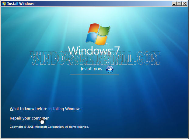 Now the "Install Windows 7" screen will appear, Click on "Repair your Computer" to continue.