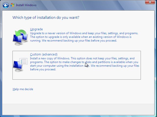 Now the "Type of installation". Click on "Custom (Advanced) to continue the install..