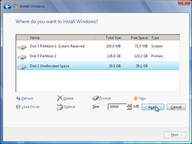 Now if setting up the drive/partition, choose the amount of space you wish to use, then click "Apply"