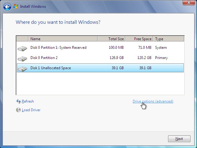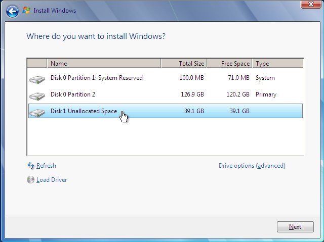 Hard drive setup comes next. Select the drive (Or partition) that Windows doesn't reside on (Usually Disk 0 Partition 2 (If parallel installing another Win7 install then this is usually where the main operating system will be as Disk 0 Partition 1 is used for System Reserved Files), Disk 1 Partition 1 (A secondary drive) or Disk 0 Unallocated Space, or Disk 1 Unallocated Space for drives/partitions not setup. So to round off: