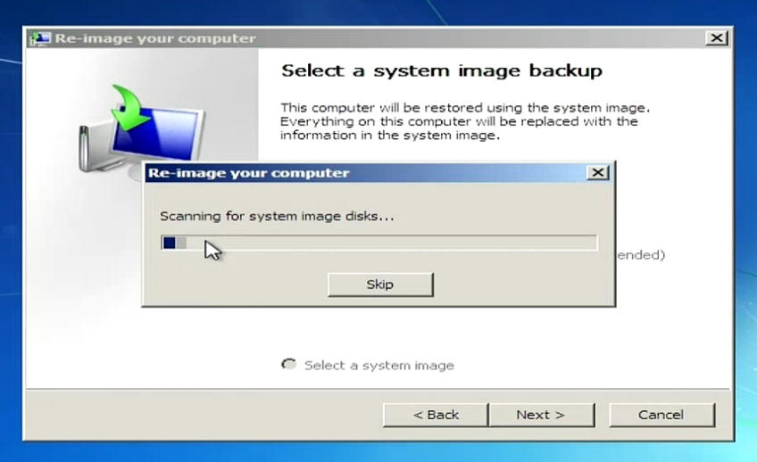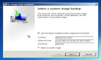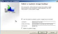 The latest backup "System image" will be found, if you have multiple images click on "Select an image" to pick another one, click "Next" to continue |