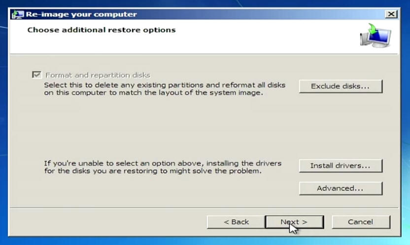 You can make further changes at this screen, exclude disks, load motherboard drivers for the hard drive, etc etc. Make any changes needed and click "Next" to continue. |