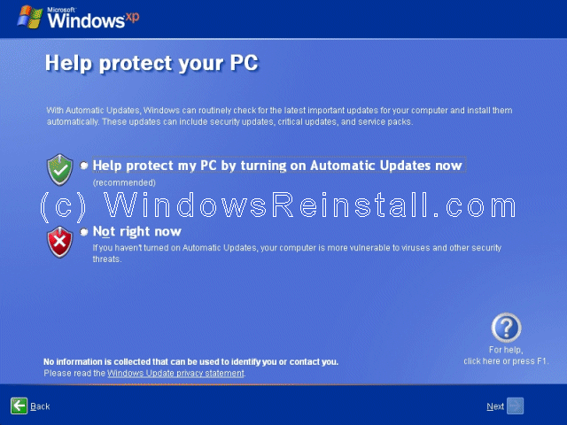 "Help protect my PC" screen now appears, click top option to enable Microsoft's Firewall, Automatic updates and virus checker warning. It is recommended to do this even if you wish to put your own firewall on later. Only select "Not Right Now" if you not intend to use the internet. Once you select your option, press "Next".