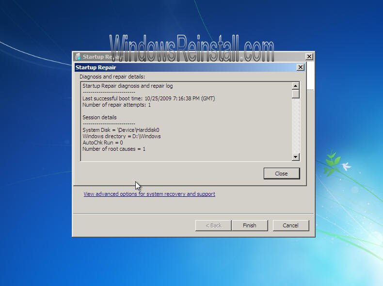 Now click on "Finish" to reboot and test your system to see if the problem is repaired.